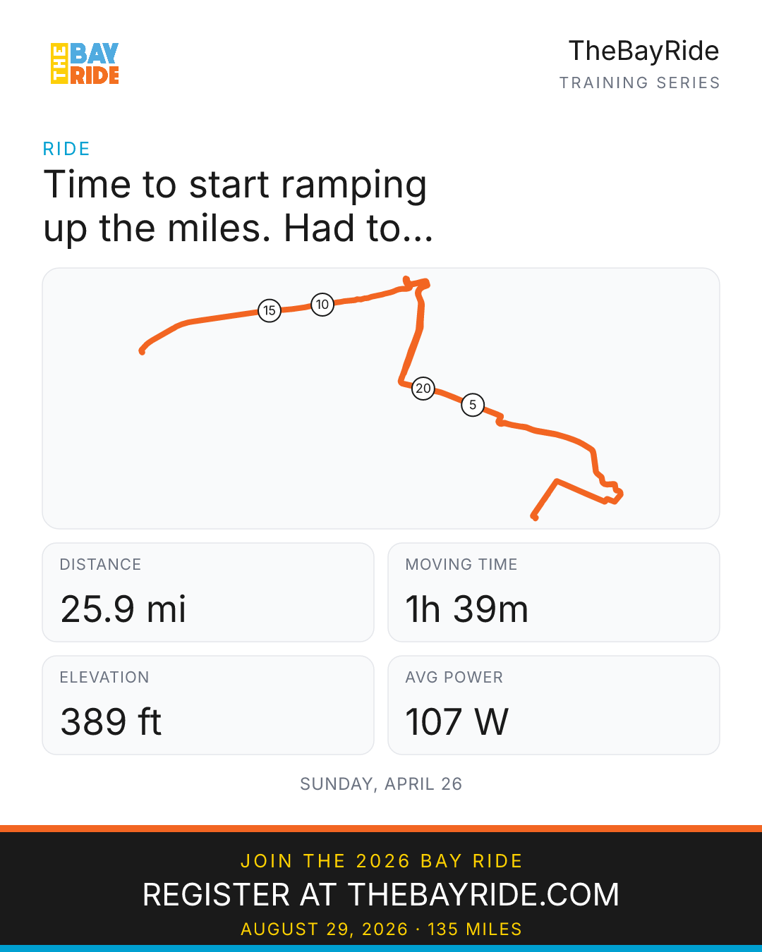 If you're riding TheBayRide in August, whether that's the 35-mile Bay crossing from SF to Oakland or the full 135-mile loop, now is the time to start moving too. Not next month. Now.